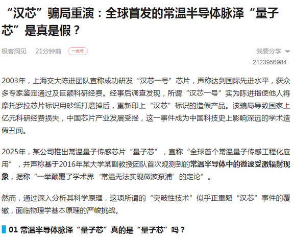 第四,都回避了专业同行评议。 正如“汉芯”始终未能量产,常温半导体脉泽技术也主要依靠媒体宣传和机构背书,缺乏在权威科学期刊上发表的、经严格同行评议的实验数据和理论分析。